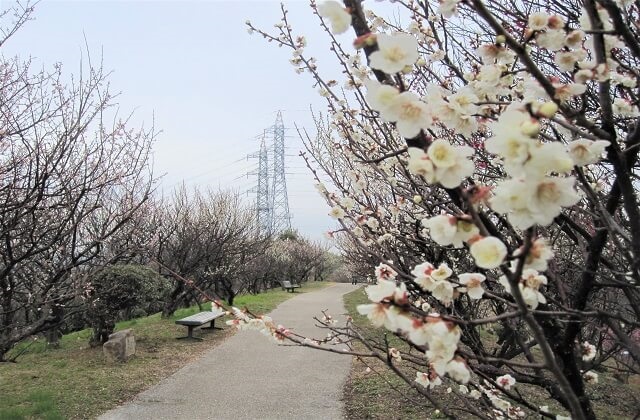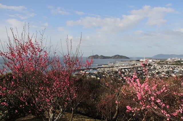 丘の上からは瀬戸内海の島々や市内の工場地帯の様子を見ることができ、梅の花の上品な香りに包まれながら、のんびりゆったりと瀬戸内の景色を眺めることができます。