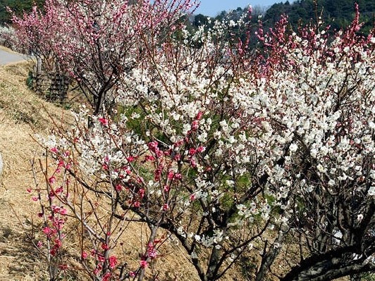公園内の梅の里には、白梅、紅梅、蠟梅が植えられ、 花の時期には山の斜面が紅白の梅の花の色に染まります。