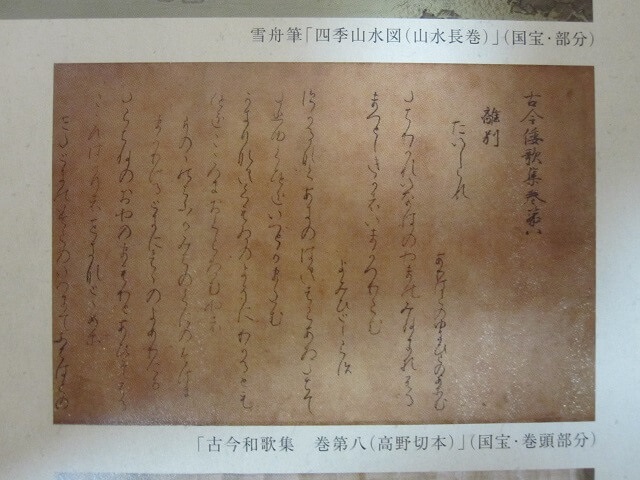 この国宝展では、収蔵品の中でももっとも有名な雪舟の描いた国宝「四季山水図」(山水長巻)、あわせて国宝の「古今和歌集(高野切本)」や「史記」、「菊蔵腰刀」などを一同に公開します。