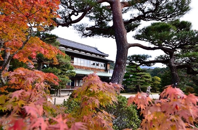 内庭の紅葉撮影には、ひょうたん池かそばのあずまやから本邸を臨むアングルがおススメ