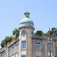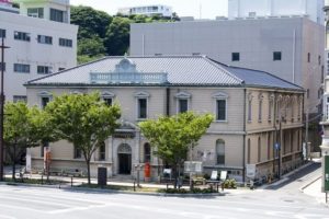 このビルは、大正4年(1915)に竣工した和洋折衷のユニークな建築物で西日本で最初の鉄筋コンクリート造り。屋上にはなんと!日本庭園と茶室を備えています!