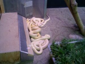 通常の白化は一代だけの遺伝子異常で終わるので、天然の白蛇は自然界にほとんど生息していません。