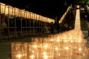 参道から境内をろうそくの明かりで照らし出す「万灯の夕べ」は行われますので、ぜひ幻想的な防府天満宮の境内をお楽しみください(今年はろうそくではなく、ブルーライト)。