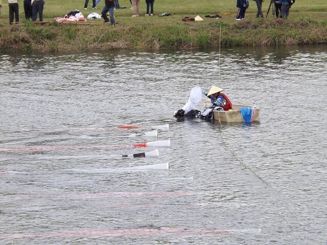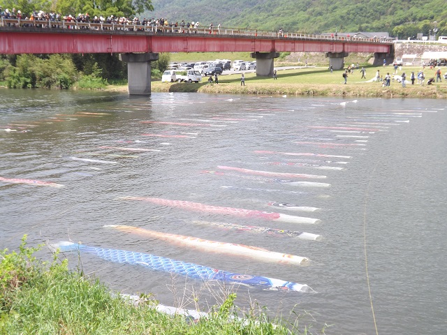 設置する様子をみていましたが、こいのぼりの様子を船に乗ってチェックしたり、あるいはロープが外れてこいのぼりが下流に流されていったり・・・。