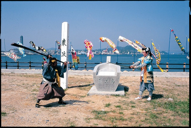いつもは静かな巌流島ですが、毎年ゴールデンウィークに行われる「海峡まつり」で巌流島フェスティバルが行われています。大綱引き大会や武蔵と小次郎の決闘の再現などが行われ、多くの人で賑わいます(参加料・有料)。