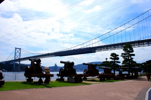 火の山公園に登る手前、海峡沿いにあるみもすそ川公園では、源平の戦い、幕末の歴史と現代の関門橋とのコラボレーションした景色を楽しめるスポットです。
