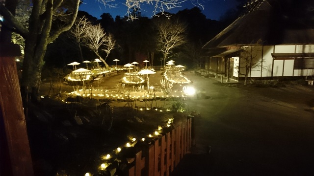 ポロン、ポロンと流れる静かな音に合わせて、ライトが点灯。古民家の庭が温かい光で優しく照らされてて、わたしすっごく気に入りました。ずーっと見ていたかったくらい。ほんとに「里山の灯り」でした。