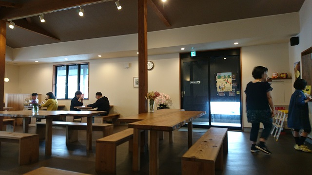 木のテーブルと椅子がそろい、広々としたくつろぎやすい空間です^^