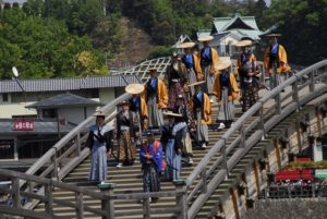 江戸時代の文化を受け継ぐお祭りで、参勤交代の大名行列が錦帯橋を渡る様子を現代に再現。