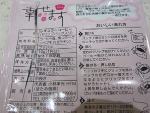 「幸せますコーヒー」には、ふつうのコーヒー、コラーゲン入りの2種類があります。