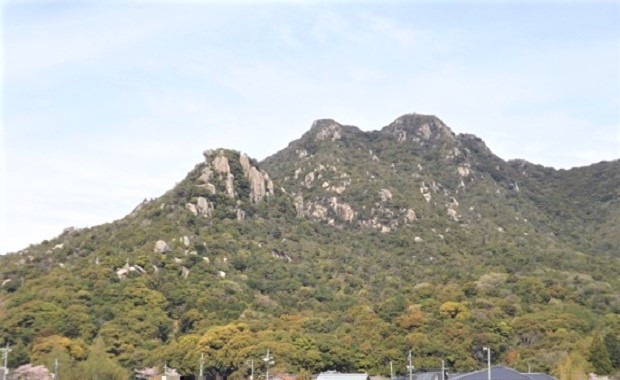 こんもりとした緑の山ではなく、緑の木々の間にがっしりぎっちりした岩肌が覗く、防府市の右田ヶ岳。