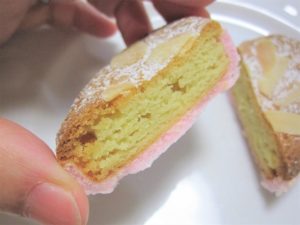 お餅でできてる最中だからこそ淡いピンク色が出せて、しかも中のアーモンドクリーム生地とは全然違った食感を出せて・・・うーん、思いついたその発想がすごすぎる!
