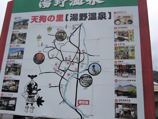 その先には湯野温泉街の案内看板もあります。ちょっと降りて見てみます・・・。