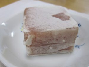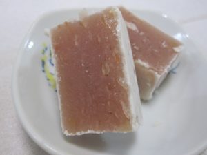 4㎝×4㎝、厚みも3㎝近くあって、ずっしりしています。白い皮から透けて見える薄い梅色にほんわかしますね。