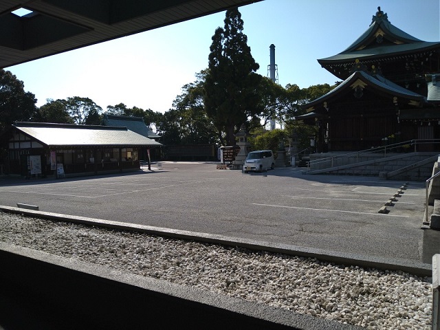 拝殿近くまで上がれる境内の駐車場、遠石会館の駐車場、神門につながっている駐車場など数か所があり、最大100台まで駐車できます(無料)。
