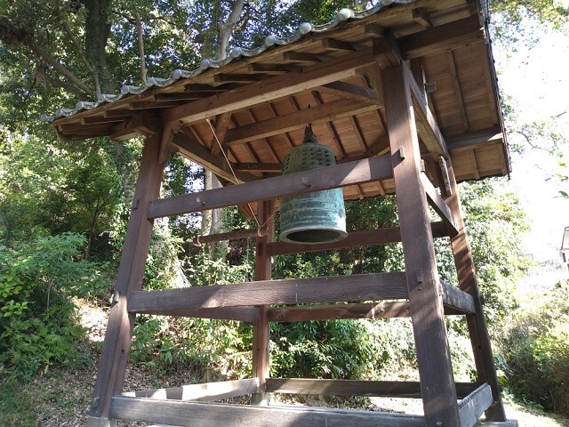 たくさんの小さな神社がある右側の脇には洪鐘があります。この洪鐘は、壇ノ浦の戦いの直前の戦いで弓矢が当たった鐘と、その後作り直した鐘とを合わせ、鎌倉時代にあたる1320年にあらためて作り直したものです。