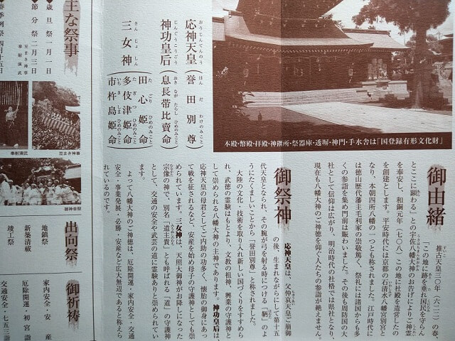 応神天皇は誉田別命(ホンダワケノミコト)とも言われ、古くから八幡神「弓矢八幡」として全国の武士から崇敬を集めてきました。