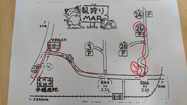 梨園は数か所あり、MAPを見てその日の梨園に車で移動するのですが、梨組合から梨園はけっこう距離があります。
