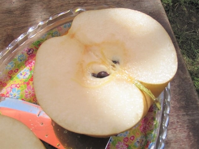 もぎ取ったばかりの新鮮な梨には、果汁もたっぷりです。