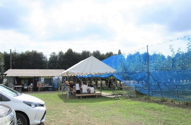梨園の奥の方にどうぞと勧められたので、ずんずん奥へ行くと、隅の方にテーブルとイス、パラソル(日よけ)が設けられていました。