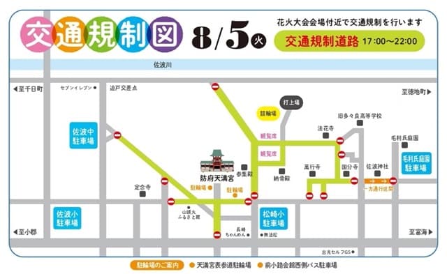花火大会当日は、松崎小学校、佐波小学校、佐波中学校、毛利氏庭園の4ヶ所が臨時駐車場として開放されます(駐車料金無料)。