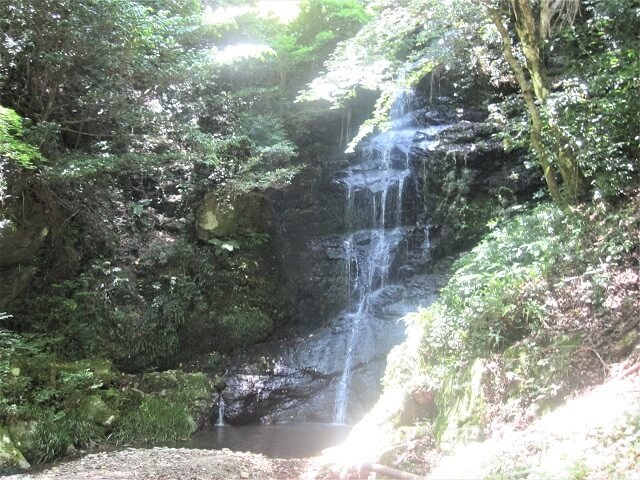 本堂の右側を奥に進むと大きな不動明王様があり、その左手奥には三段になった滝が見えてきます。写真は下の段で、さらに上に2段になった滝があります。