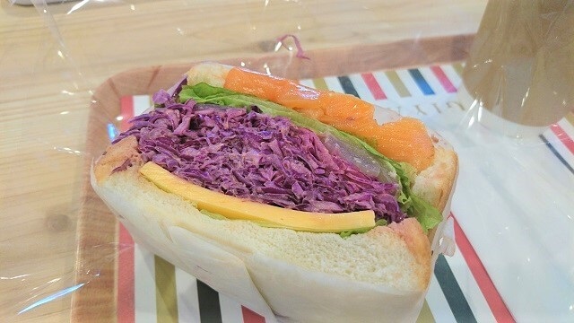 スモークサーモンとチェダーチーズの間には、紫キャベツのピクルスがたーっぷりと!