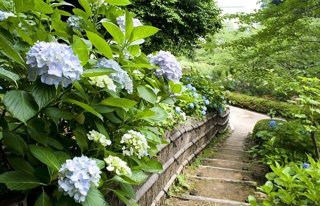 山手にある三の蔵近くにあじさいが植えられており、6月なかばにはとても美しく散策道を彩ります。緑と淡い水色がとてもきれいです。