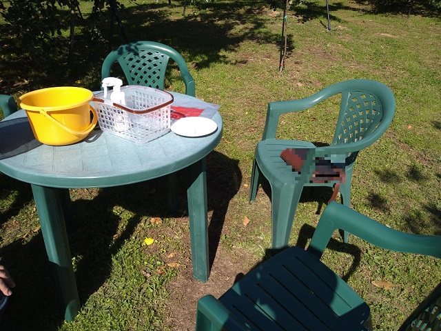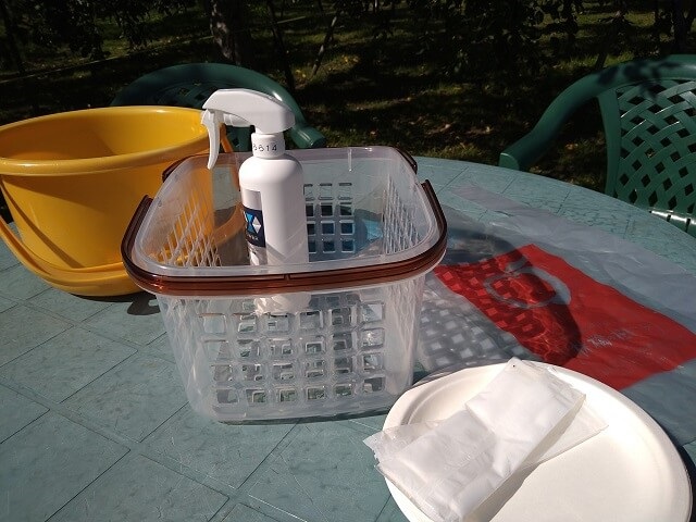 受付で料金を支払うと、ゴミ入れのバケツ、除菌スプレー、お手拭き、紙皿をセットで手渡してくれます。