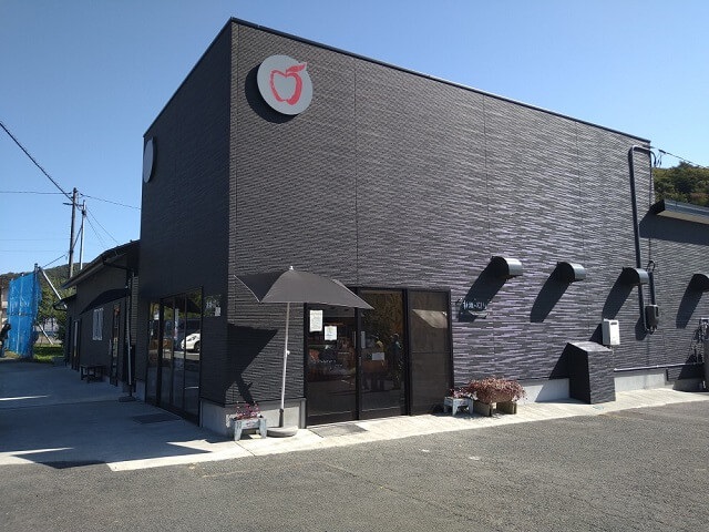 建物は新しく、売店は街角のちょっと小さなケーキ屋さんのようなたたずまい!昔ながらのりんご園が立ち並ぶ中、林檎の樹ららはものすごく斬新です(写真は売店)。