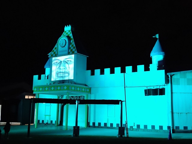 去年までキラキラ輝いていたお城が青緑色にあやしく光り、しかも男の人の顔が・・・お城が呪われているようです。