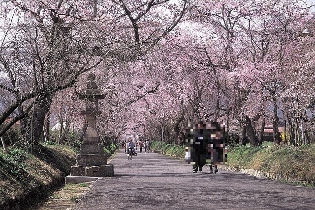 およそ370mある参道の両脇には、しだれ桜やソメイヨシノが植えられていて、境内の桜の数はおよそ360本!