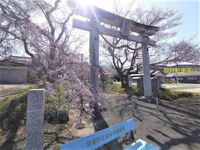 「しだれ桜」と書かれた看板のある信号から鳥居側に曲がって道なりにいくと、境内の近くに舗装された駐車場(約15台無料)があります(駐車場となりに水洗トイレあり)。