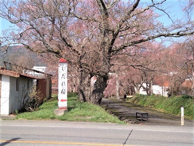徳佐八幡宮の目印は、国道9号線ぞいにある「しだれ桜」と矢印の看板と、「徳佐しだれ桜」の標識です。