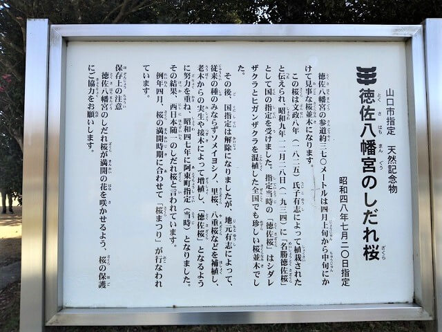 徳佐八幡宮のしだれ桜の説明板によると、参道の桜は文政8年(1825年)、江戸時代に初めに、氏子有志が取り寄せて植えたものなのだそうです。