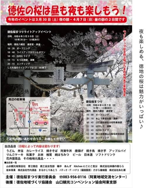 | 2024年の開催 | 3月30日(日)【徳佐桜まつりライトアップイベント】 18時30分~ |