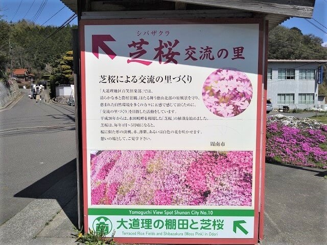 山口県棚田20選に選ばれている、大道理(おおどうり)地区の棚田のあぜ道には、12万株もの芝桜が植えられ、きれいなグラデーションを作っています。