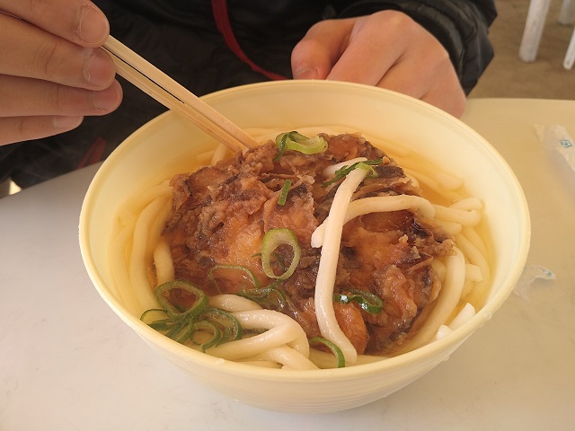 野外で食べるうどん。おまつりやバザーを思い出しますね!