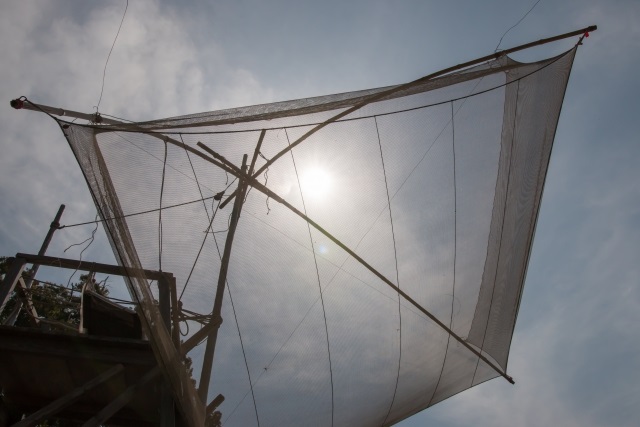 遡上してきたシロウオの一部を、2メートル四方の四角い網ですくいとります。これを四ツ手網漁(よつであみりょう)と呼びます。