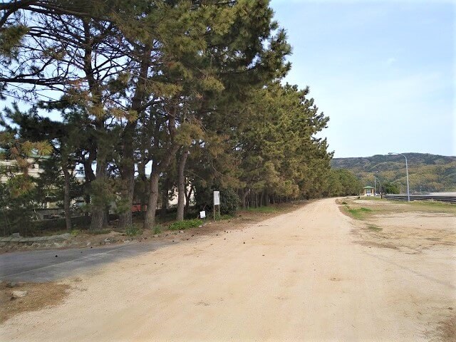 砂浜からはきれいな海と空、右手にはJR山陽本線、後ろを振り返れば整然とそびえる松林。