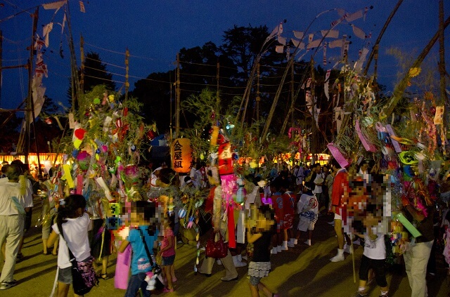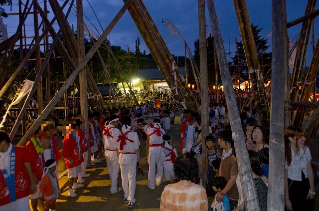 男性たちは、2本の竹を継いで幟(のぼり)を飾り付けた大幟(おおや)と呼ばれる長さ20~30mの竹を担ぎ、女性たちは切籠(きりこ)と呼ぶ灯籠を吊した笹竹を持って、鬼石の上に据えた大太鼓の周りを舞い踊ります。