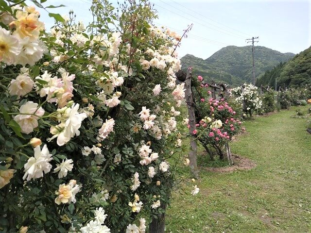 静かな里山で5月のバラを満喫できる、長門市俵山の「里山ローズ」。