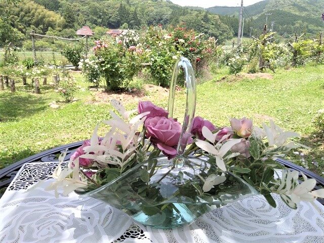 水場などにはバラの花を浮かべられたり、テーブルにはバラを飾られていたり。