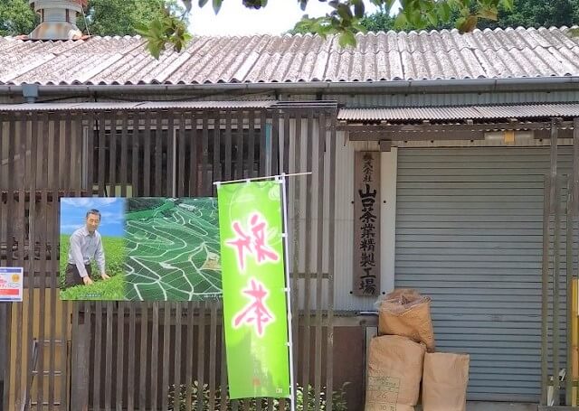 つき当たって左側の道を登ると広い駐車場があり、そのとなりの敷地が山口茶業の建物になります。