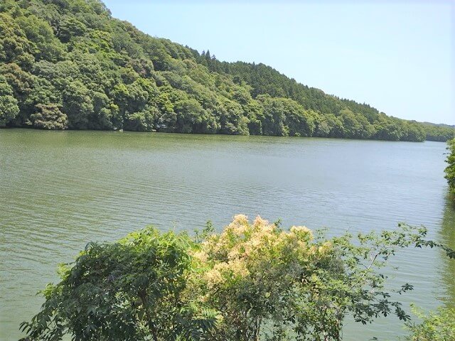 山口茶業の建物は小野湖畔にあるので、天気が良い日には湖畔のベンチに座って小野湖を眺めながらソフトクリームをいただけます。