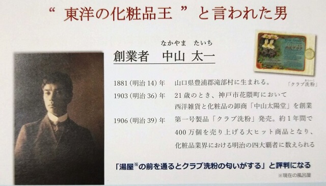 明治14年(1881年)、滝部村(現在の下関市豊北町滝部)に生まれ、クラブ化粧品で知られる、現在の「クラブコスメチックス」の前身となる「中山太陽堂」を創業した人物です。