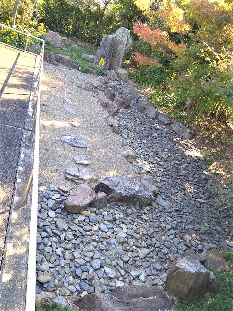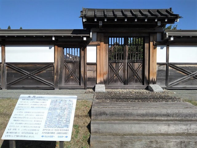 大内館の土塁が復元され、西側には西門、枯山水庭園、東側には池泉庭園(ちせんていえん)や石井戸など、当時の大内館の様子がわかるように再現されています。