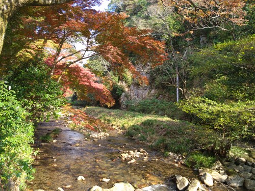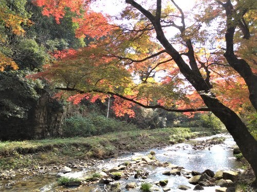 清流と赤く色づいたモミジのコラボレーションは見事です。