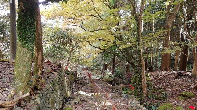 本堂の先の石段は、温座堂跡に続き、さらに進むと華山の登山道へ続いています。