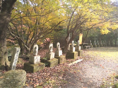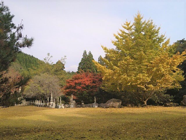 本堂の向かいには三十三観音や宝きょう印塔などがあり、その奥には大きなイチョウの木が何本も植えられている広場が整備されていました。